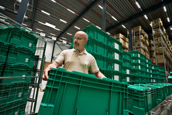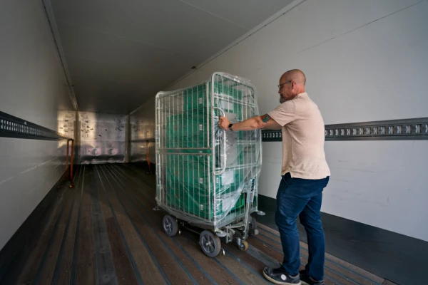 Varerne blev tidligere leveret i papkasser fra Regionslager Midt, men fra efteråret 2020 sendes alle varer til hospitalerne ud i grønne plastkasser, som dem projektchef hos DKI Logistics Jens Møller her kører på lastbil ved regionslagret. Plastkasserne giver ikke bare bedre arbejdsgange og hygiejne, men også et 27 pct. mindre CO2-aftryk ift. pap – også når produktion af plastkasserne og løbende afvaskning indregnes.